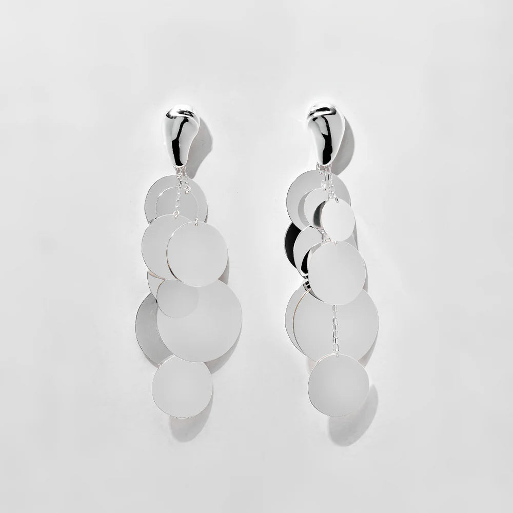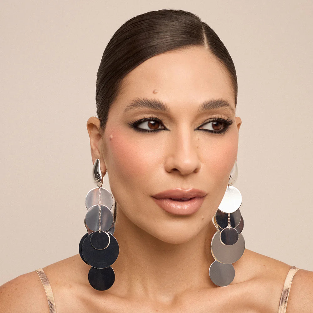 El arete tiene la propuesta minimalista de representar las manchas del jaguar en una referencia moderna y conceptual, con su base removible en metal liso y pulido y péndulo que se despliega en láminas circulares de metal dando el efecto de brillo y movimiento como el hermoso pelaje del animal.