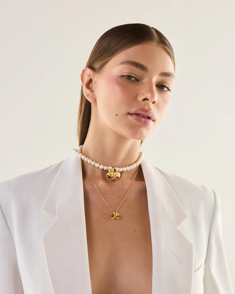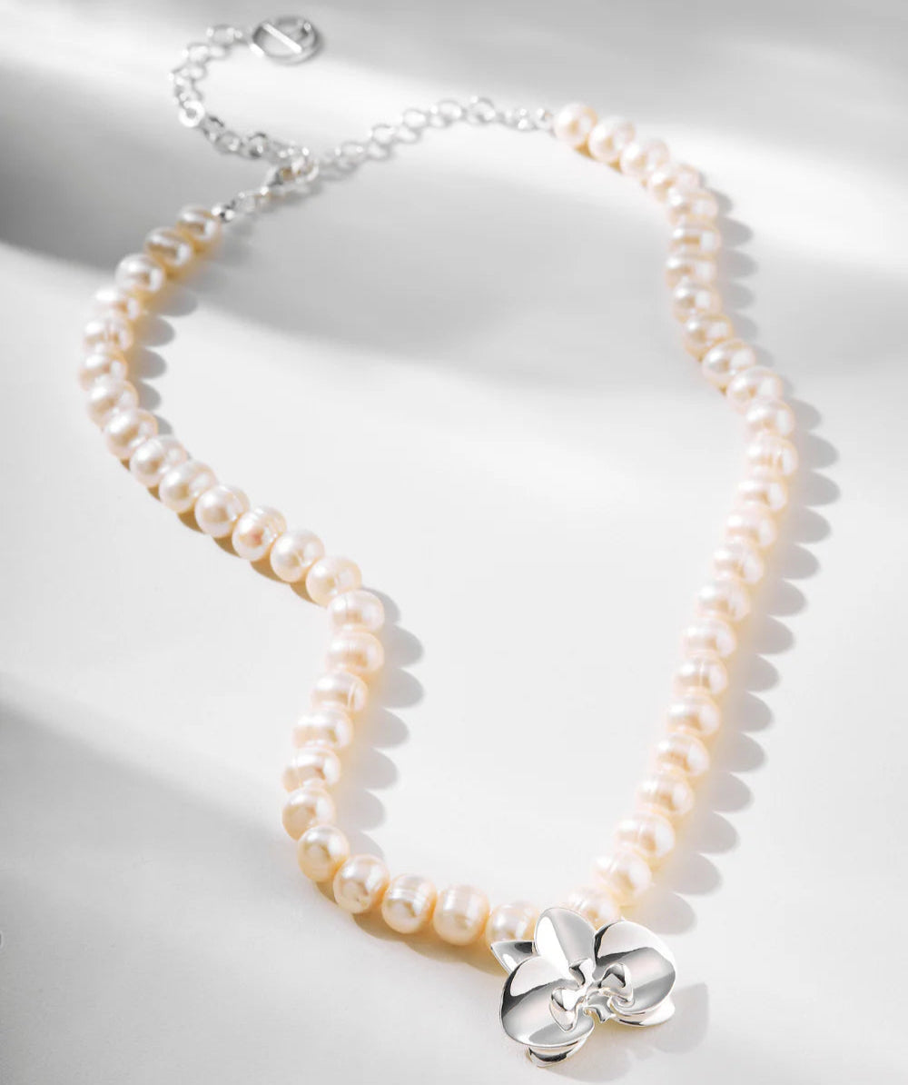 Nuestro collar combina el encanto atemporal de las perlas (a veces blancas, a veces negras) con nuestra icónica orquídea, elaborada en metal finamente pulido y disponible en nobles acabados en plata y oro.