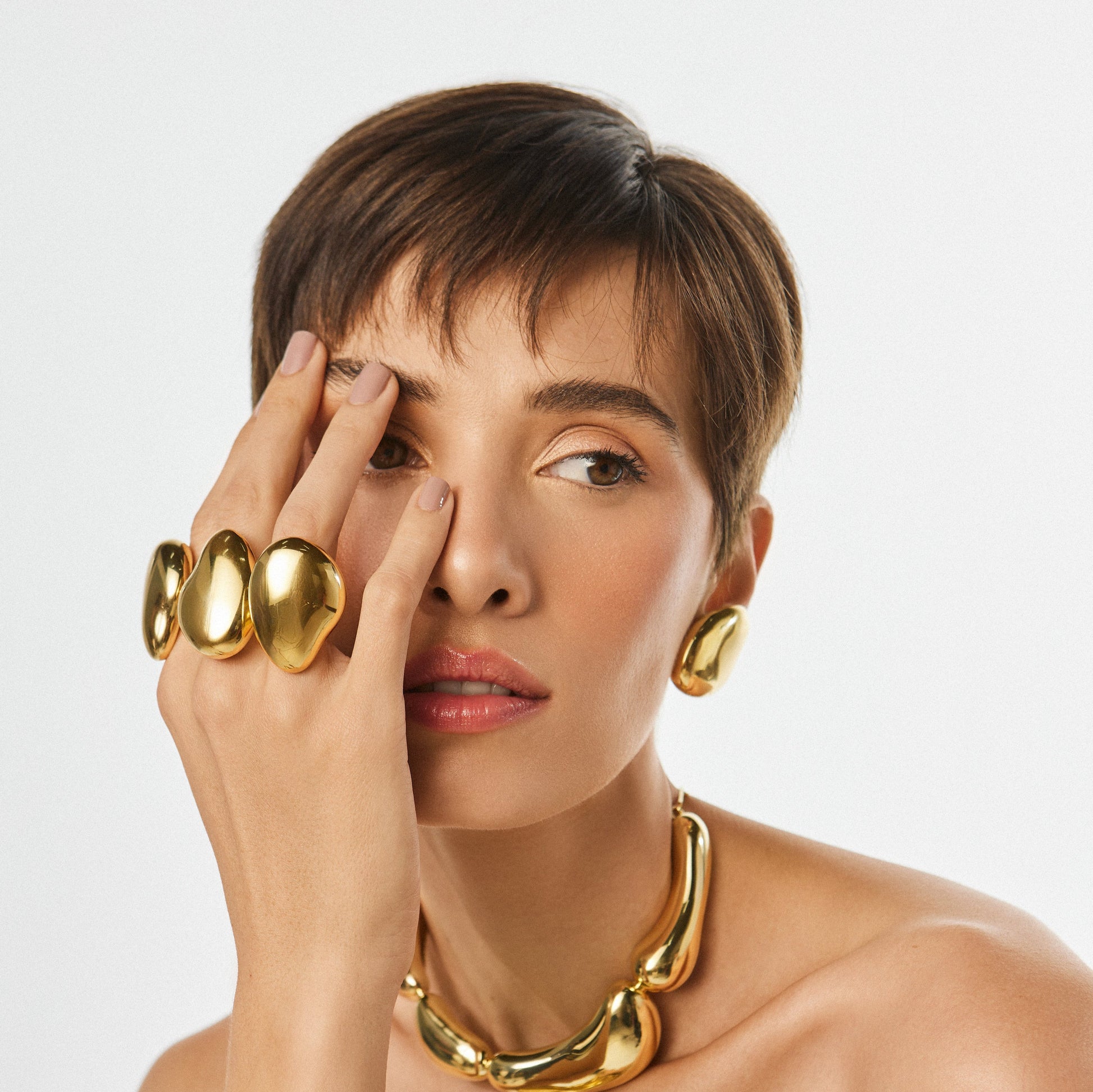 El anillo es una elegante pieza de joyería, inspirada en las formas orgánicas y abovedadas de las gotas de rocío que se forman en las superficies al amanecer. Este anillo está elaborado en metal liso y pulido, dándole un acabado sofisticado y contemporáneo.