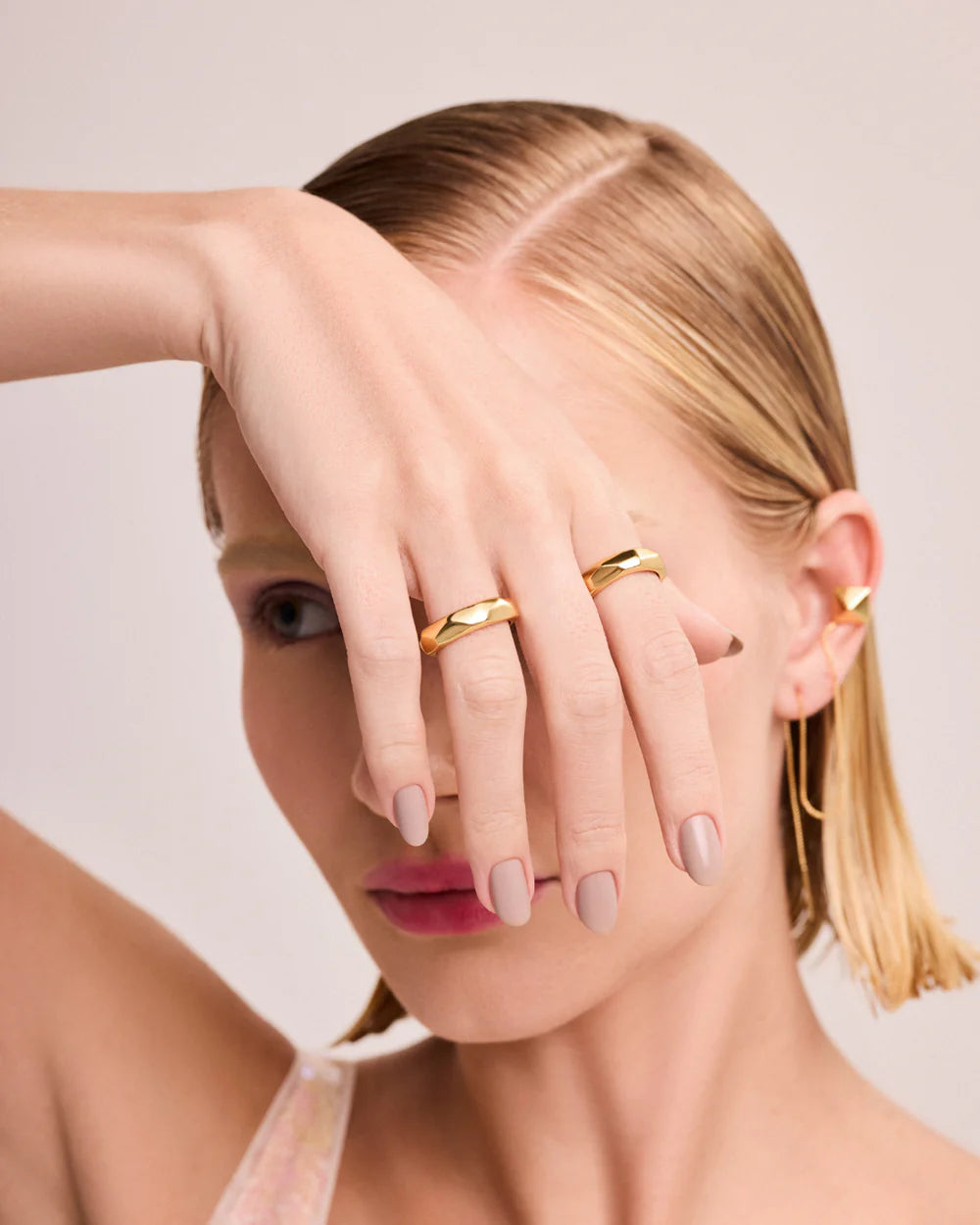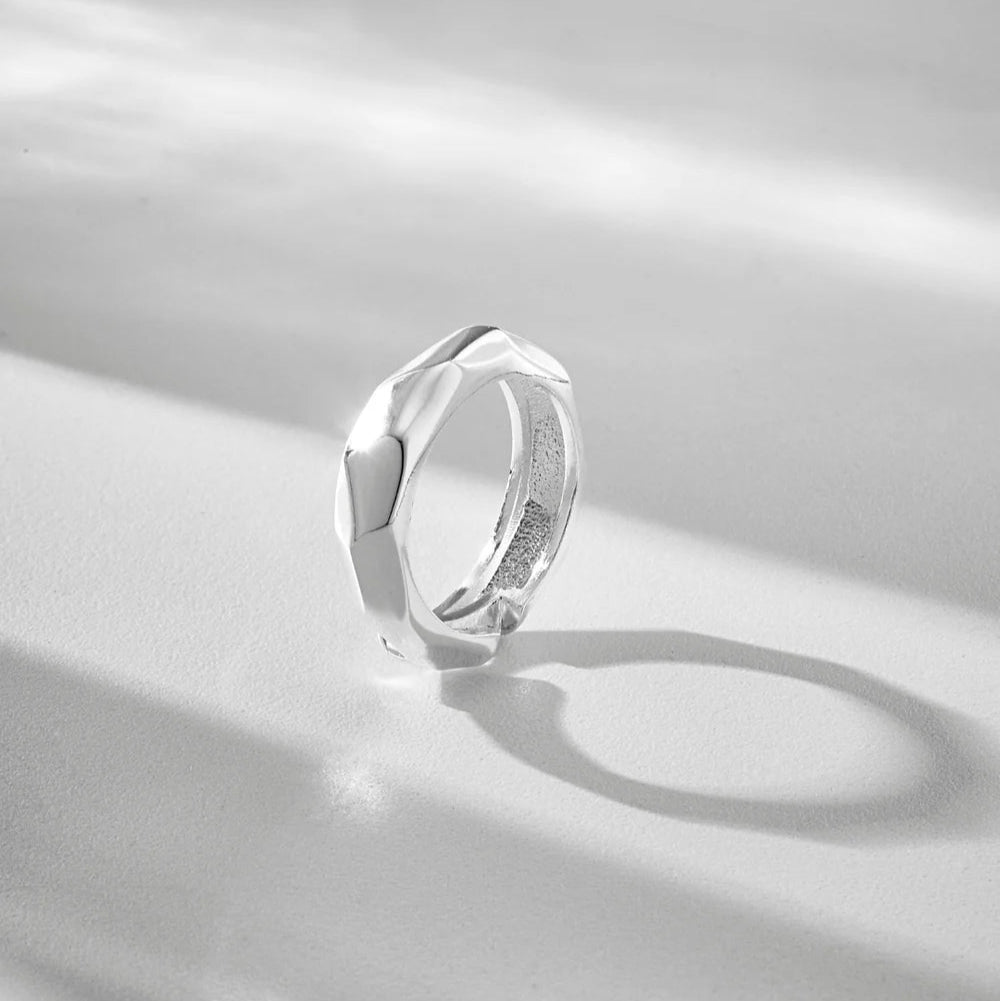 Las líneas utilizadas para la identificación facial se proyectan como facetas en los anillos. Delinean las manos, otorgando una personalidad e identidad únicas a quien las luce. Son piezas versátiles que, al combinarse con una variedad de acabados, garantizan un look moderno y contemporáneo. Las líneas dinámicas aportan movimiento a la pieza, transmitiendo una sensación de aventura y vitalidad.