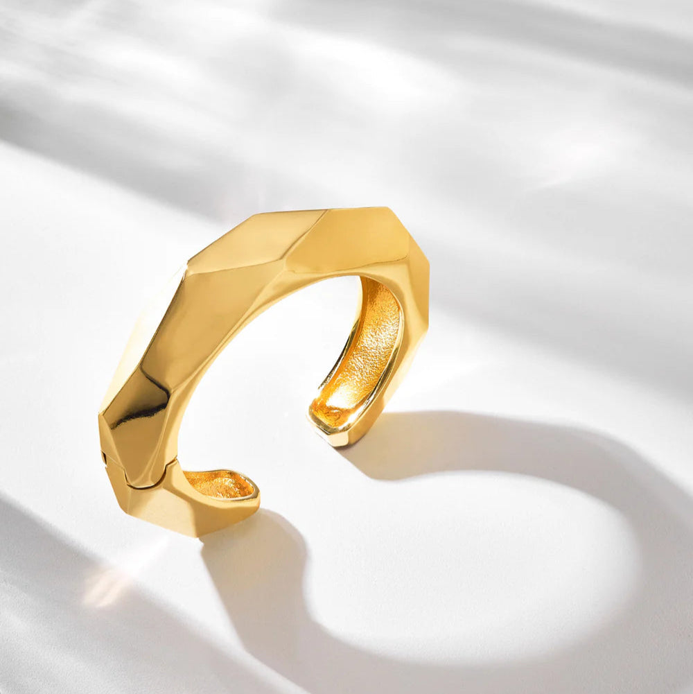 La potente pulsera facetada de nuestra colección transmite fuerza y estabilidad. Una pieza diseñada con un sistema de resorte que se adapta a diferentes tamaños de muñeca y puede usarse como pulsera o brazalete de tres cuartos. Su brillo extremo se presenta en nuestro noble baño de oro y plata.